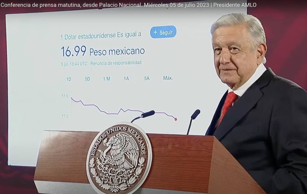 julio 5, 2023 julio 5, 2023Fortaleza del peso mexicano frente al dólar pone contento a AMLOLa fortaleza del peso mexicano frente al dólar, rompió el piso de las 17 unidades. “Esto no pasaba en décadas”, celebró AMLO